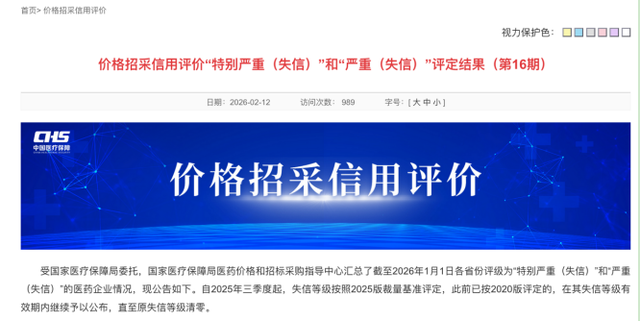 近期,国家医保局正式公示第16期医药价格和招采信用评价结果。这份截至2026年1月1日的全国医药企业失信评级名单,共涉及153家企业。其中,按2025年三季度起适用的2025版裁量基准,评价为“特别严重失信”的企业达52家,“严重失信”企业37家。此外,先前已按2020版标准评定的失信企业中,有10家维持“特别严重”等级,54家维持“严重”等级。